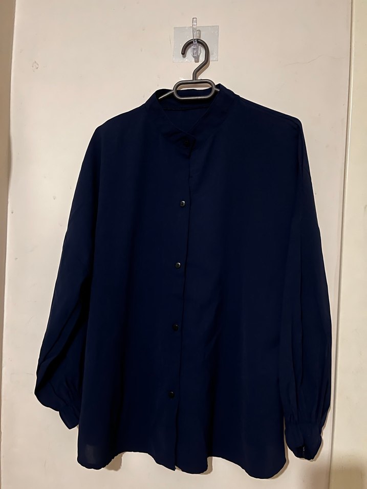 Lacivert keten kadın gömlek, yakalı ve düğmeli kapamalıdır. Uzun kollu, bol kesim ve midi boydadır. Ofis için minimalist, sade bir tarzdadır.