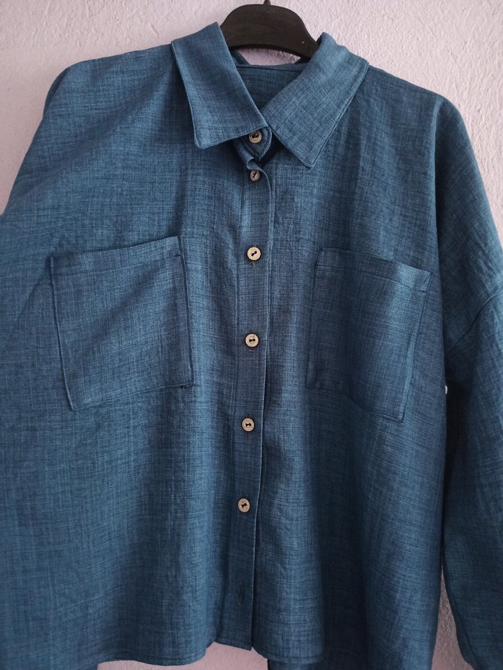 Mavi keten gömlek, düğmeli, uzun kollu ve geniş kesimdir. Notlu yaka ve iki ön cep detaylarıyla günlük salaş bohem stil sunar.( Eteği de mevcuttur, ekleyecem.)