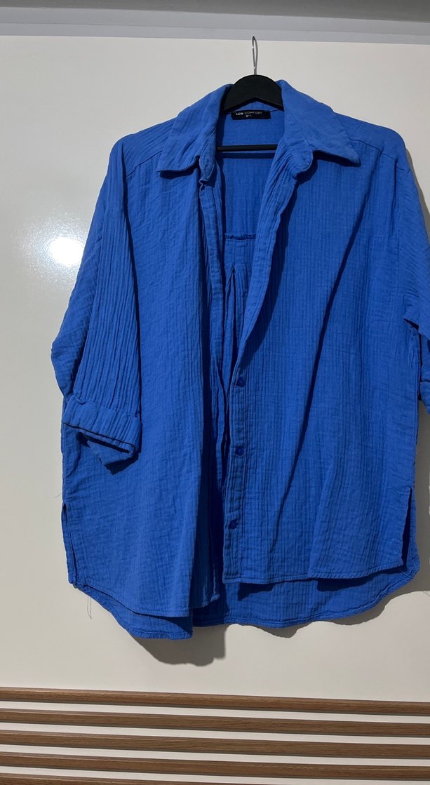 Lacivert keten kumaştan kadın gömlek, düğmeli, uzun kollu ve yakası notched lapel. Bol kesim ve midi boyda, günlük kullanıma uygun minimalist bohem tarzda.