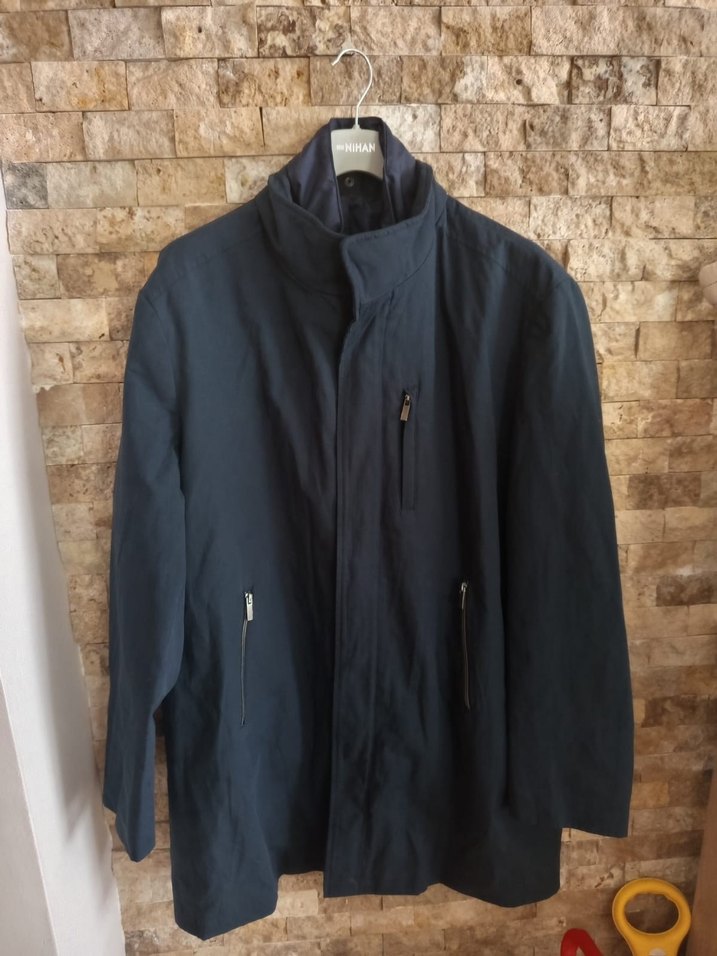 Lacivert keten erkek ceket, normal kesim ve çıtçıtlı yaka ile. Uzun kollu, fermuarlı ceplidir. Günlük sokak stili için uygundur.