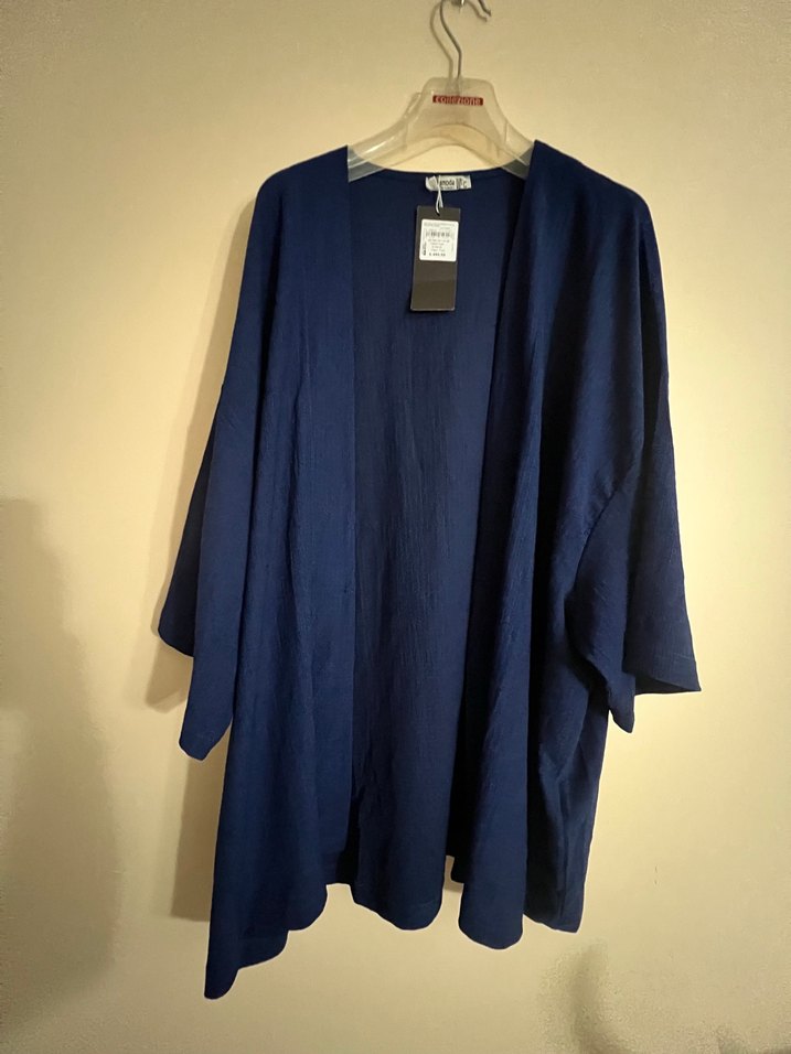 Lacivert keten kumaştan, uzun kollu, bol kesim ve yakası kesik detaylı midi kadın kimono, günlük kullanım için uygundur. Takım olarak almıştım ama sadece kimonoyu satıyorum etiketli sıfır ürün kalıbı geniştir