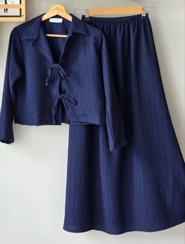 Lacivert keten kumaştan, pilili uzun etek ve yakalı, kordonlu kollu, regular fit ceket içeren kadın takımı.