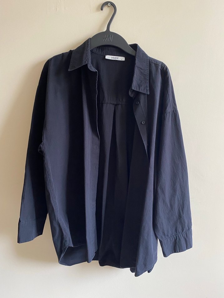 Lacivert keten kumaştan, notalı yakalı ve uzun kollu, salaş kesim kadın gömleği, minimalist normcore tarzıyla günlük kullanıma uygun.