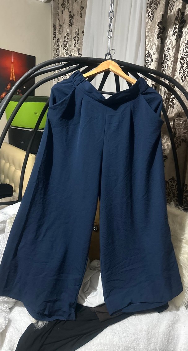 Lacivert keten kumaştan, salaş kesim ve midi boyda, drapeli kadın pantolon. Rahat ve günlük kullanıma uygun.