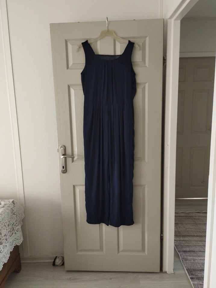 Lacivert keten hamile tulumu, bol kesim ve drapeli tasarımıyla, askısız ve kolsuzdur. Nefes alan kumaşı günlük kullanım için uygundur.