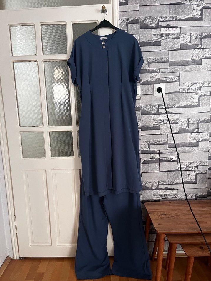 Kısa kollu, yaka detaylı lacivert keten tulum, rahat kesimi ve uzun paçasıyla günlük kullanıma uygundur.