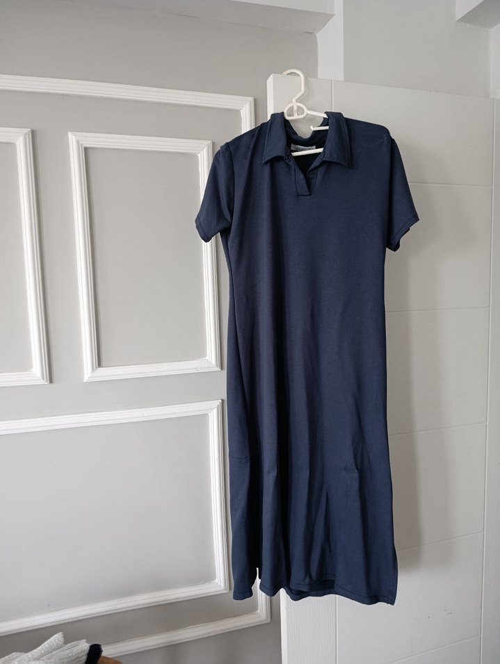 Lacivert keten kumaştan yapılmış, kısa kollu, yakalı ve drapeli uzun hamile elbisesi. Rahat kesimiyle günlük kullanıma uygundur.