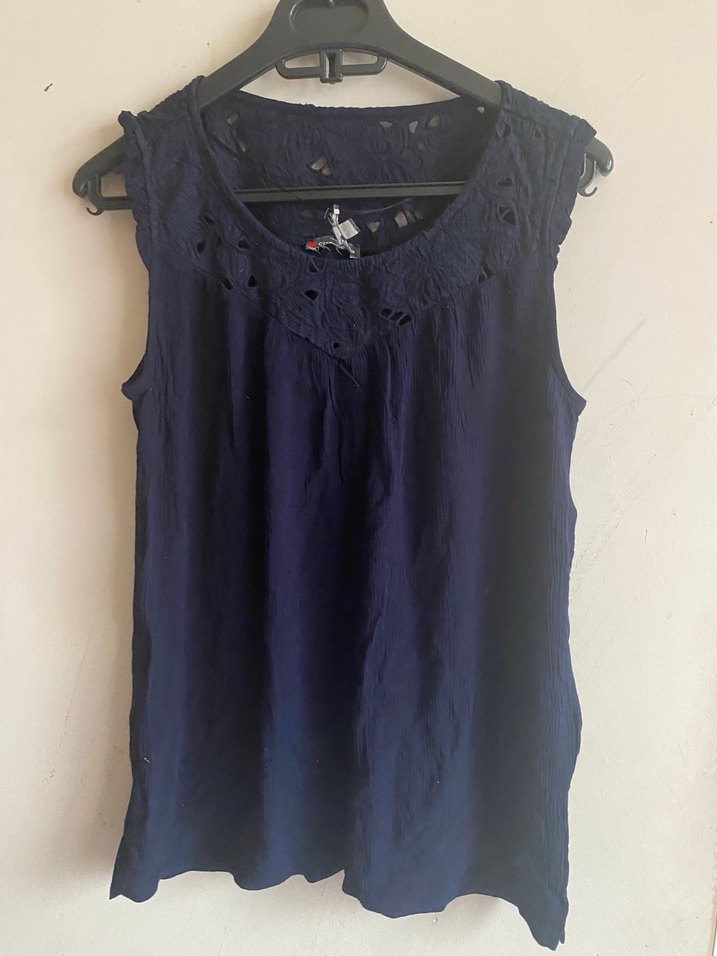 Yumuşak keten kumaştan, V yakalı ve fırfırlı detaylı lacivert kolsuz bluz. Bol kesim ve midi boyda, bohem tarz için uygun.