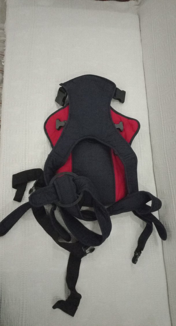 lacivert- kırmızı ayarlanabilir kayışlara sahip bebek taşıyıcıdır. Bebeğin ağırlığını dengeli şekilde destekler.