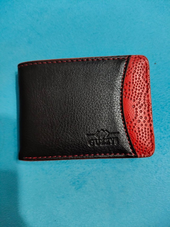 Siyah deri üzerine koyu kırmızı desenli detaylı, iş tarzı ve karşı kültür stilini birleştiren erkek cüzdanı.