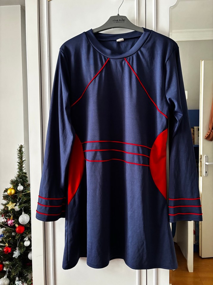 Lacivert, uzun kollu ve fitted kesime mayo üst , kırmızı detaylarla drapeli ve yumuşak, sıcak kumaştan üretilmiştir. Sayılı giyilmiş tertemiz kullanılmıştır iç kısmında göğüs pedli kısmı mevcuttur Kolaltı 53 cm Boy 84 cm Kol boyu 62 cm Esnektir Ölçüler Mezura ile tek yön ölçülmüştür