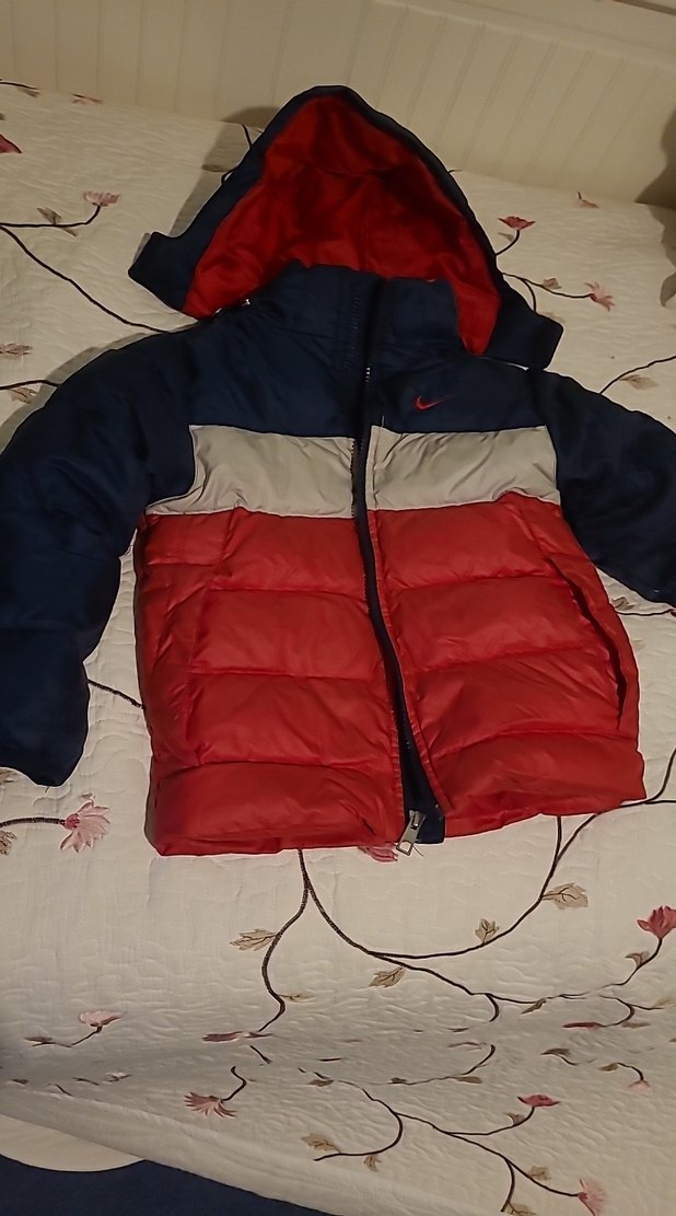 Fermuarlı, kapüşonlu ve yakası kesik detaylı kırmızı ve koyu renklerin birleştiği, çocuklar için fit kesim mont. Orijinal Nike marka Sokak stili için uygun, yumuşak ve sıcak