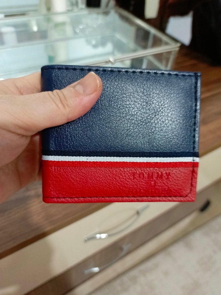 Lacivert ve kırmızı renk bloklu, beyaz şeritli ve kırmızı kısımda Tommy logosu kabartmalı erkek cüzdanı. Minimalist ve streetwear tarzına uygundur.