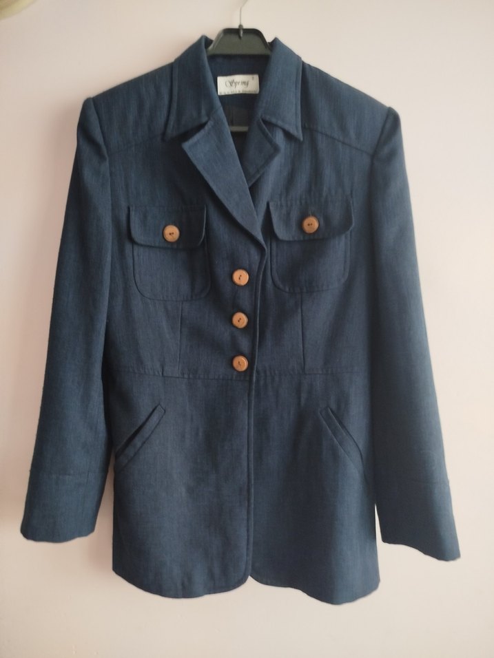 Lacivert renkli, düğmeli, kısa kesim denim kadın blazer ceket. Uzun kollu ve klasik yakalı, ofis için uygun, rahat kesim.