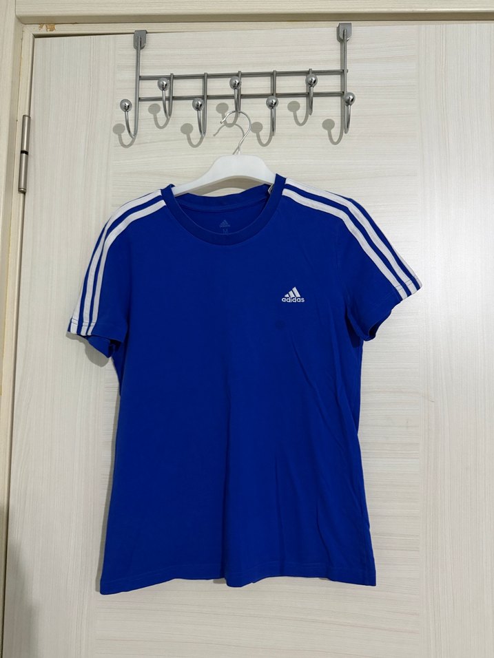 Pamuk kumaştan, kısa kollu ve bisiklet yakalı mavi Adidas tişört. Omuzlarda baskılı çizgilerle sportif sokak stili için uygun. Orjinal üründür .
