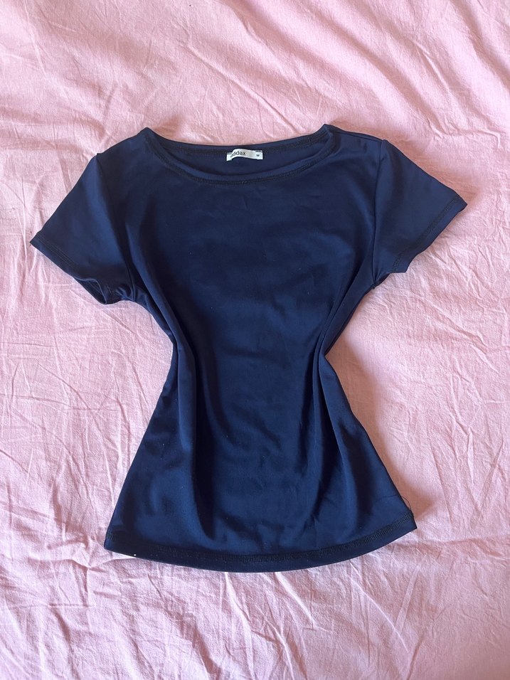 Lacivert kısa kollu, yuvarlak yakalı, düz ve sade tasarımlı, vücuda oturan sentetik kumaş tişört. Günlük kullanıma uygun minimal ve normcore tarzda.
