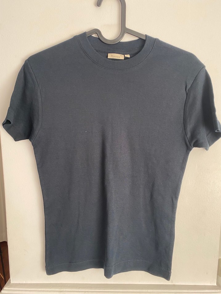 Resimlerde renk tam cikmadi, laciverttir, kısa kollu ve bisiklet yakalı, penye, basic kesim kadın tişörtü.