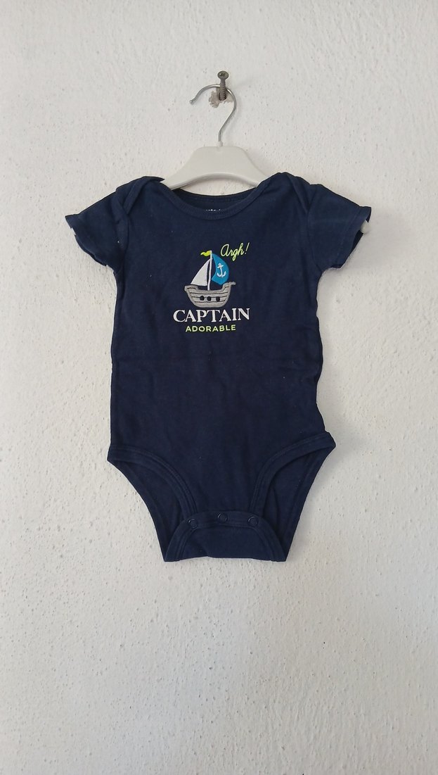 Lacivert kısa kollu, yaka tipi yuvarlak, kaptan temalı baskılı ve düğmeli bebek body.