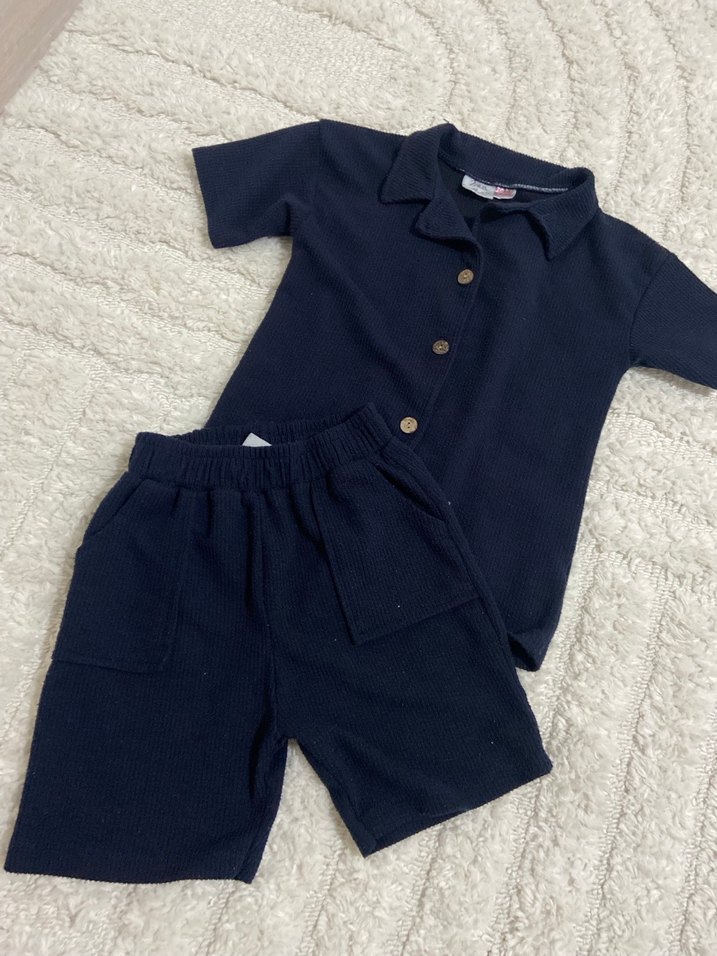 Lacivert kısa kollu, düğmeli bebek erkek takımı. Yumuşak kumaştan, kesik yaka ve lastikli bel şort ile.
