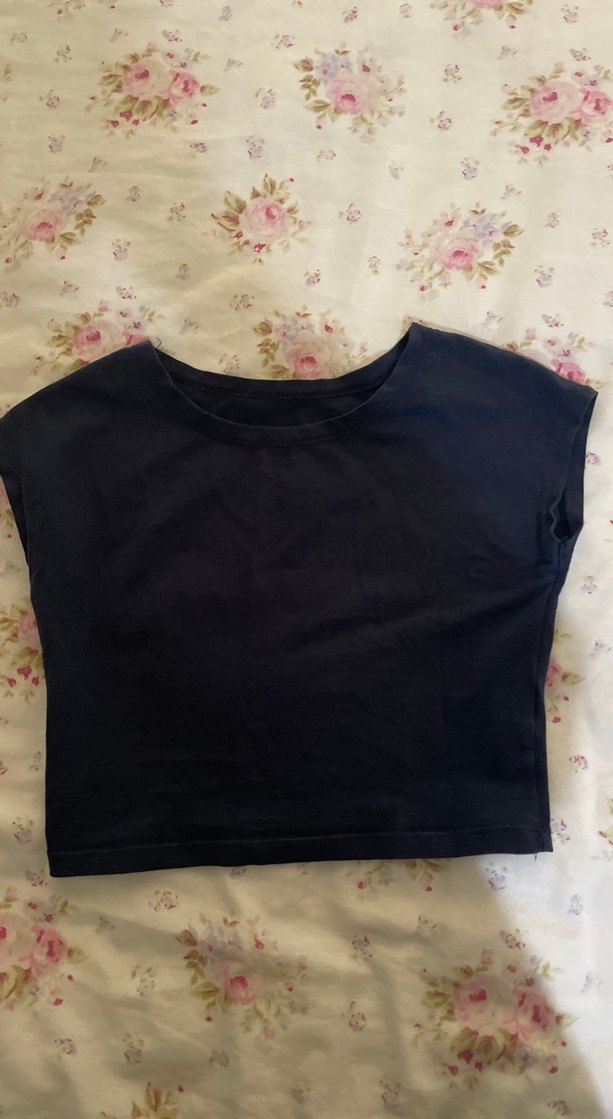 Lacivert crop top, yuvarlak yaka ve kısa kollu. Yumuşak sentetik kumaştan, bol kesim ve minimalist goth tarzında, günlük kullanıma uygun.