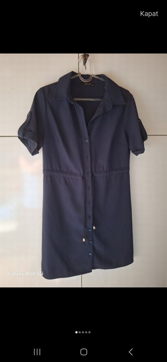 Lacivert renkte, kısa kollu, yakalı ve düğmeli elbise Midi boyda, bol kesim ve belinde bağcıklı detay bulunur. Ofis için uygundur. bol kesim