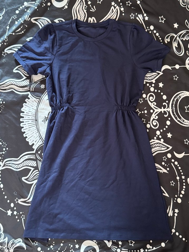 Lacivert, kısa kollu ve bisiklet yaka elbisesi, drapeli tasarıma sahip ve sentetik kumaş kullanılmış.