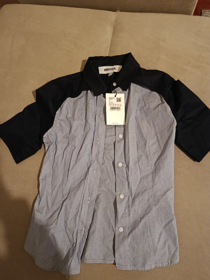 lacıvert kısa kollu, yakalı ve düğmeli gri gömlek. Pamuklu yumuşak kumaştan, rahat kesim,cızgılı desene sahip.