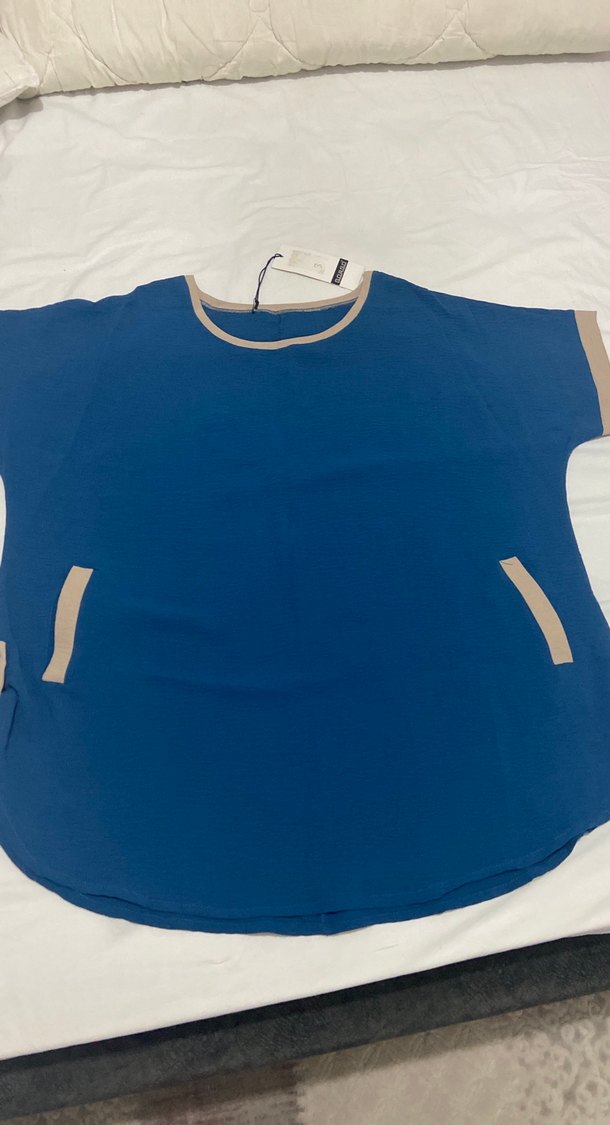 Lacivert kısa kollu kadın keten tişört, yuvarlak yakalı ve bol kesimdir. Bej detaylı yakası ve cepleriyle günlük rahat ve şık bir görünüme sahiptir. İki kol arası 65 66 cm boy omuzdan 74cm