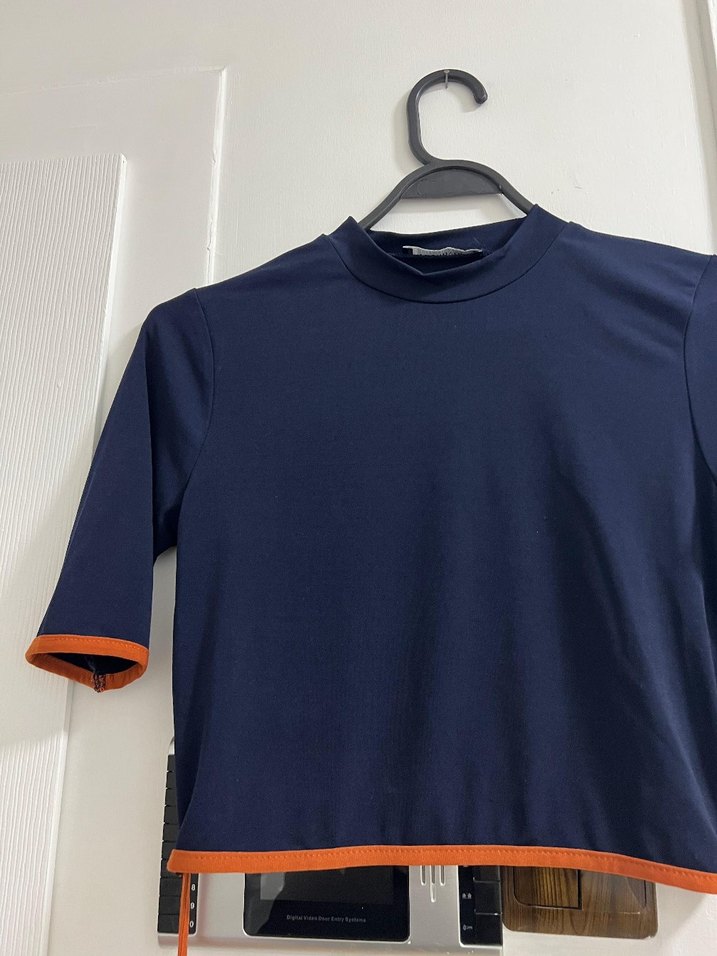 Lacivert ve turuncu detaylı, kısa kollu, yuvarlak yakalı, dar kesim tişört. Günlük kullanıma uygun, şık ve rahat athleisure tarzında.crop