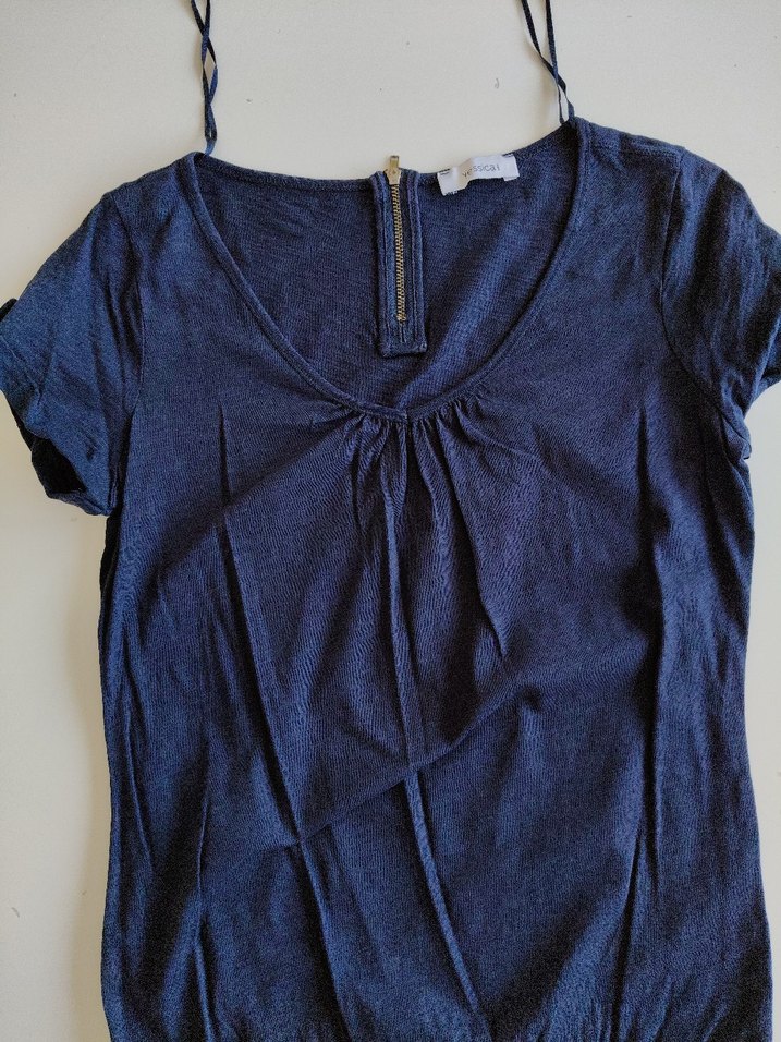 Lacivert renk, kısa kollu, yuvarlak yakalı bluz Arkasında fermuar ve rahat bir kesime sahip. Günlük kullanıma uygun denim kumaştan yapılmıştır.