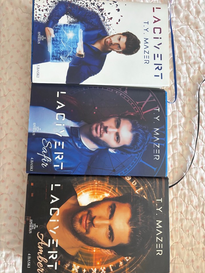 T.Y. Mazer'in Lacivert üçlemesi, dijital ve mistik temalı kapaklarla üç roman içerir. Arsen yayınevi, 4. baskılar. Temtemizler