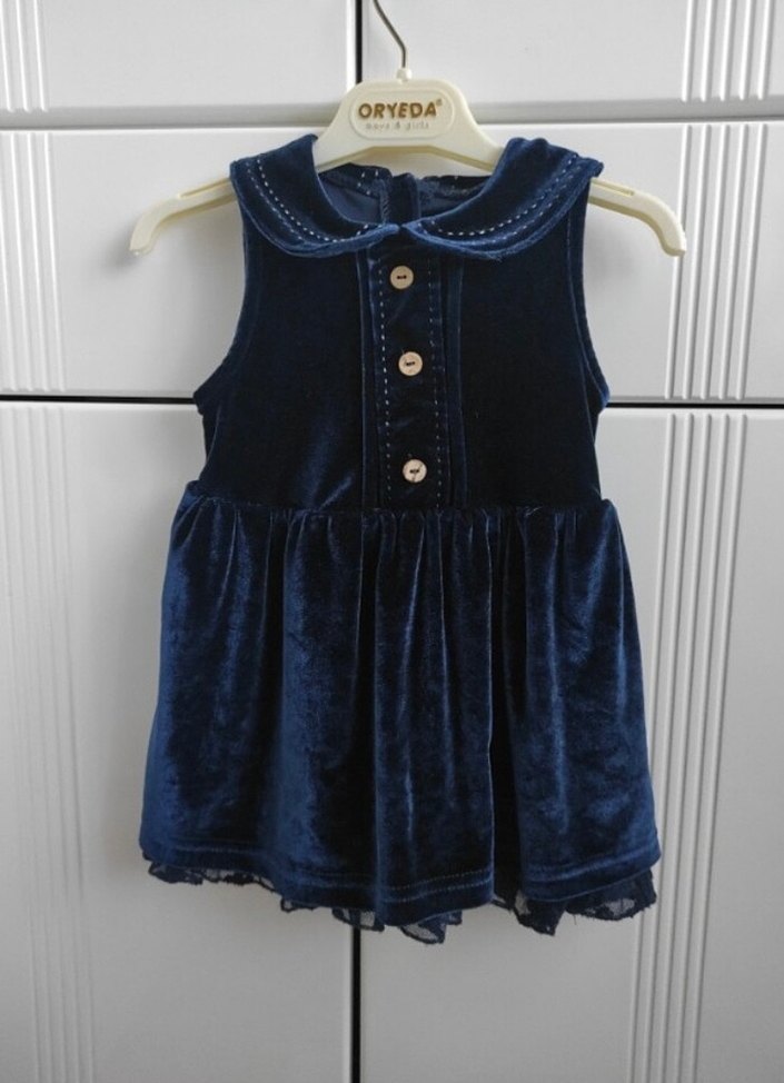 Düğmeli, kolsuz ve yakalı bu lacivert elbise, yumuşak ve şık kumaştan olup nakış detaylara sahiptir. Sırtı özel olarak yaptırıldı bi kere giyildi 9 aydan 18 aya kadar olur .