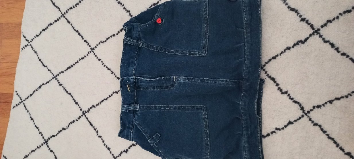 Düğmeli, bol kesim, lacivert denim mini boy kot etek. Günlük rahat sokak stili için uygundur.