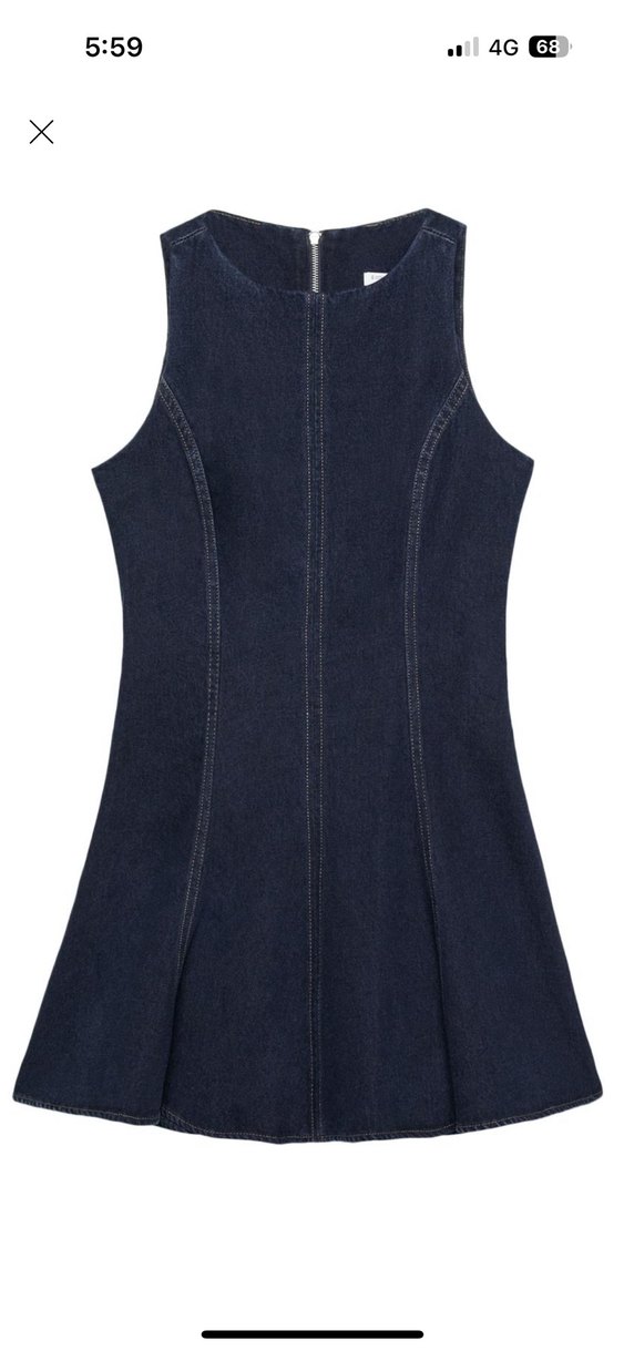 Lacivert kolsuz denim elbise, sıfır yaka ve fermuar detaylıdır. Fitted kesim ve sade normcore tarzıyla günlük kullanıma uygundur. Normal boyda uzunluğu. Sadece bir kere giyebildim 1 kere yıkandı. Durumu çok iyi.