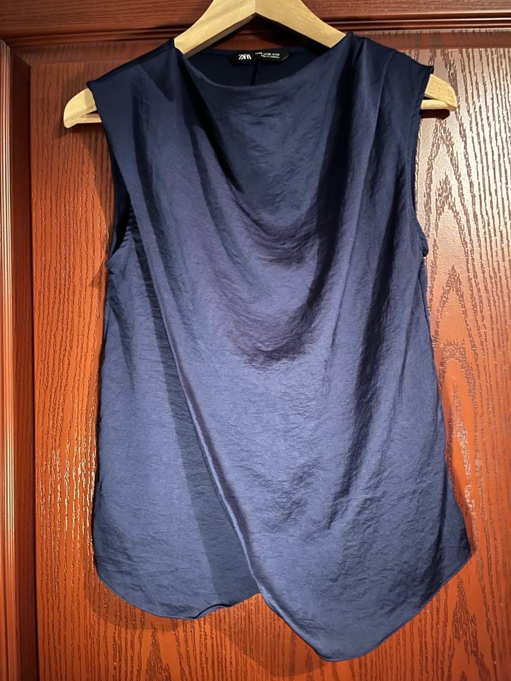 Lacivert renkte kolsuz, hafif degaje yakalı ve drapeli tasarıma sahip bol kesim bluz. Minimalist ve normcore tarzda, günlük kullanım için uygundur.