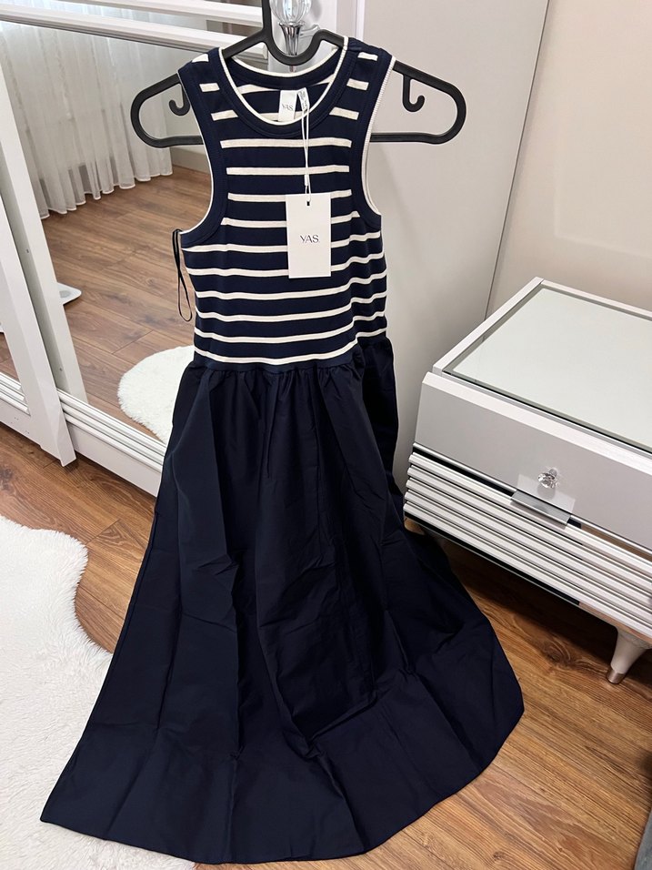 Lacivert uzun elbise, kolsuz, üst kısmı çizgili ve vücuda oturan, pilili etek kısmı dokuma kumaştan. Yüksek yakalı, günlük kullanıma uygun normcore tarzda. Yas marka s ve m beden mevcut