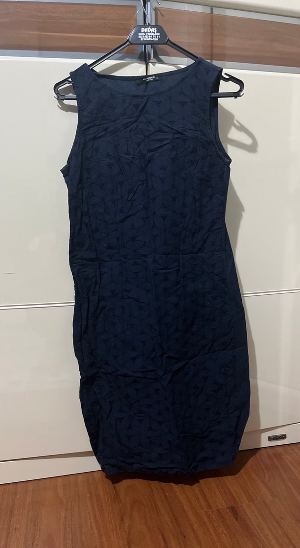 Lacivert renk, kolsuz bisiklet yaka içinde astarı mevcuttur hamileliğim ilk zamanları kullandım gayet rahat bir elbise