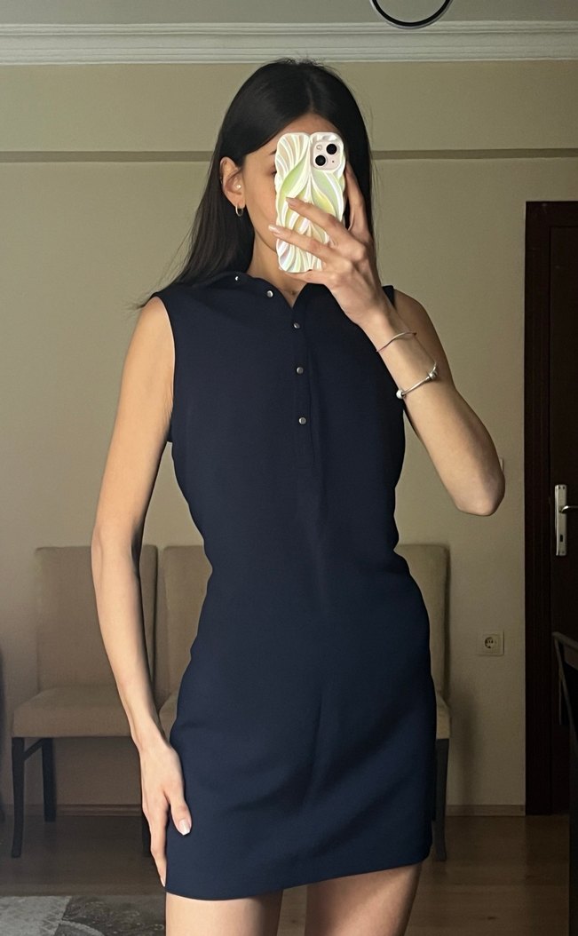 Lacivert renk, kolsuz ve yakalı midi elbise. Düz ve ince sentetik kumaştan, ofis için şık ve rahat bir model.