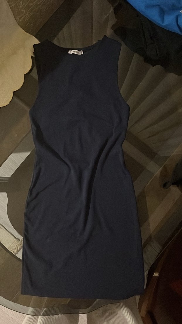 Lacivert kolsuz midi kalem elbise, yüksek yakalı ve vücuda oturan kesimiyle minimalist bir sokak stili sunar.