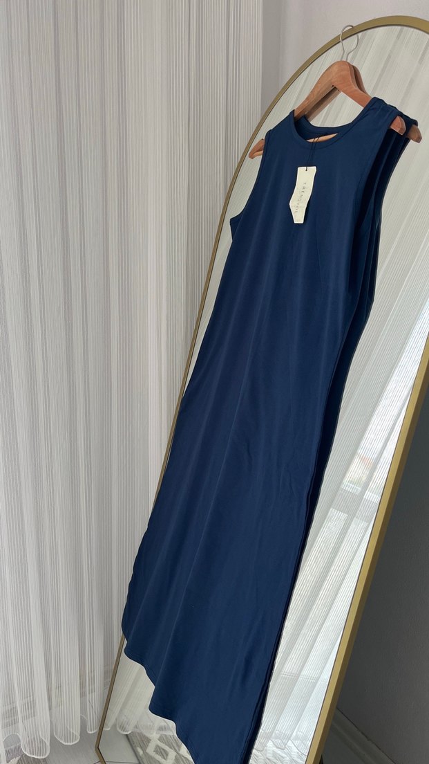 Lacivert renkli, kolsuz uzun elbise. Farklı renk ve bedenleri mevcuttur .