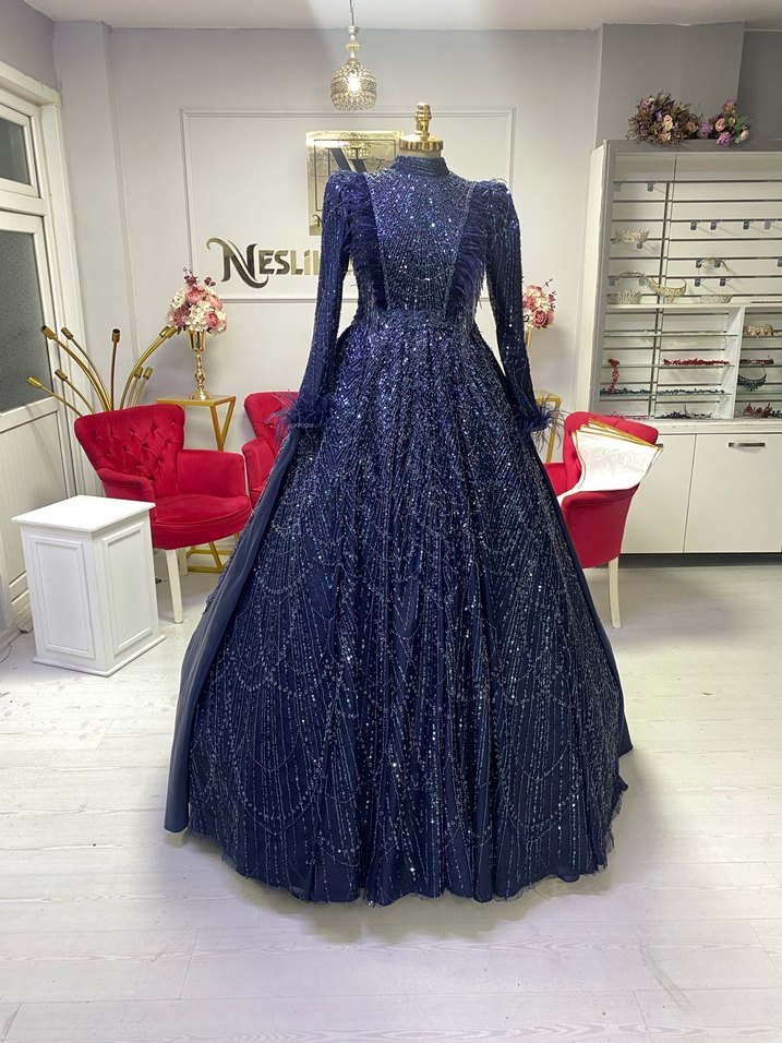 Lacivert komple dantel tüylü ve taş sarkıtlı nişanlık