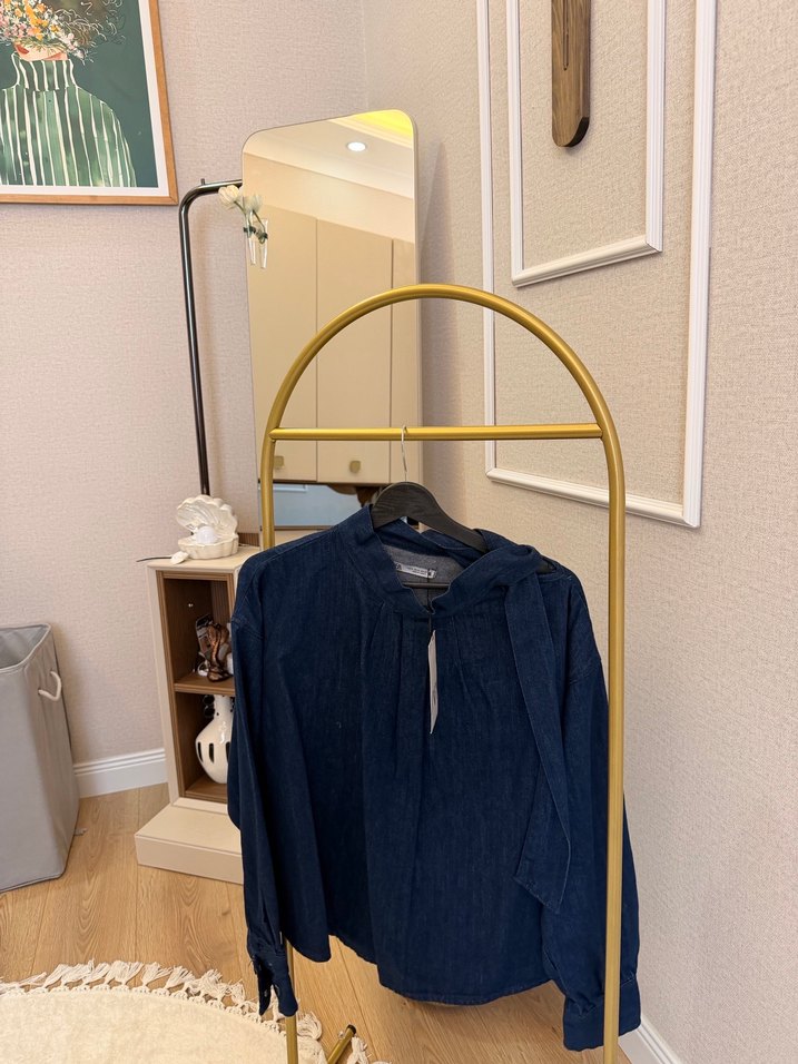 Yumuşak kumaştan lacivert gömlek, bol kesim ve bağcıklı yakaya sahiptir.