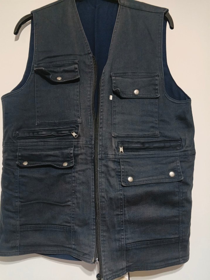 Fermuarlı lacivert kot kumaşlı, çok cepli, yakalı ve regular fit erkek yelek, günlük rahat sokak stili için uygundur.