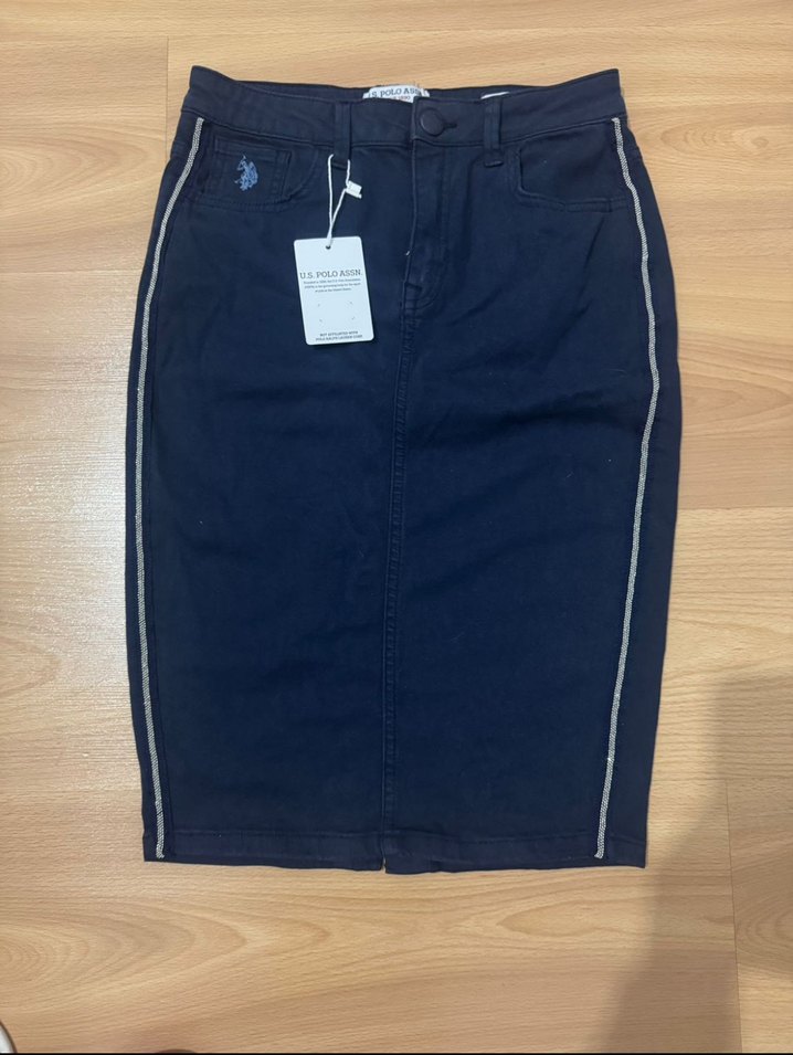 Lacivert kot kumaştan, kemerli ve yan şerit detaylı midi boy kalem etek. Rahat kesimiyle günlük sokak stiline uygundur.