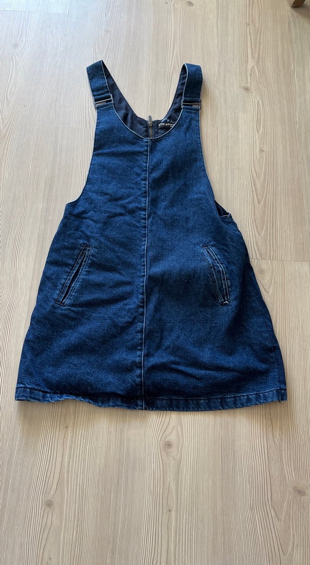 Lacivert kot kumaştan, yüksek yakalı ve kemerli, bol kesim kısa salopet. Yan cepleriyle günlük sokak stili için uygun.