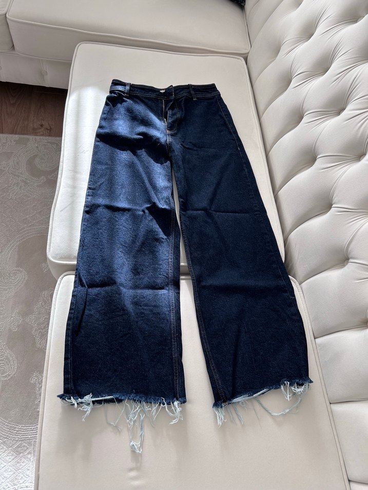 Lacivert kot pantolon, bol paça, yırtık paça detayıyla günlük rahat ve şık bir stil sunar.