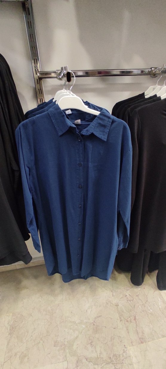 Lacivert kot kumaştan, uzun kollu, yakalı ve düğmeli önlü rahat kesim midi uzunlukta gömlek elbisesi. Günlük sokak stiline uygun.