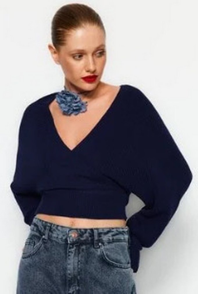 Koyu mavi renkte, V yakalı ve uzun kollu kruvaze triko kazak. Günlük, doğal stile uygun bir parça. Tarzıma uygun olmadığı için satıyorum. Hiç kullanılmadı.