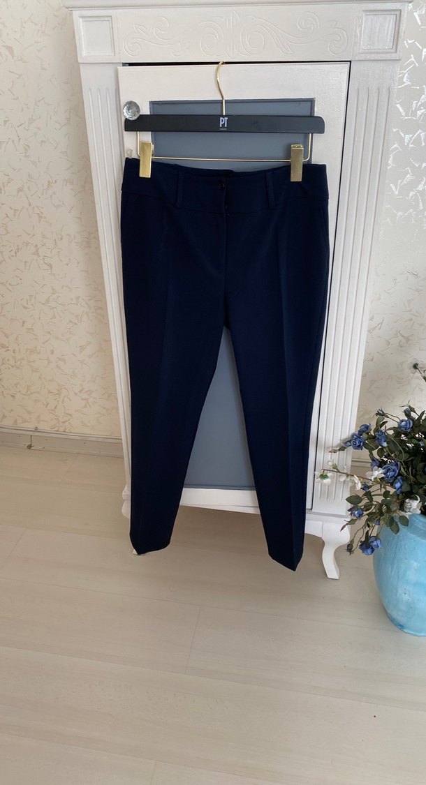 Lacivert kumaştan, normal boy midi uzunluğunda, kemerli, iş ortamına uygun kadın pantolonu.