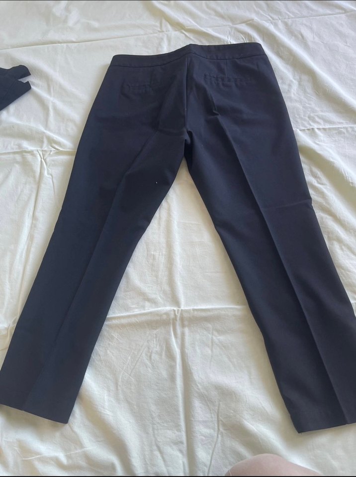 Lacivert kumaş kadın pantolon, normal boy midi uzunlukta, kemerli ve düz desensiz. Ofis kullanımı için uygun, sade tasarım